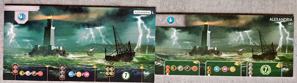 Assez peu au final, le mode 2 joueurs n’est plus présent dans la règle ni les cartes qui l’accompagnait. Soyons francs, quasi personne ne jouait à 7 Wonders à 2 et depuis, 7 Wonders Duel a fait son apparition dans le créneau et nous a tous comblé.