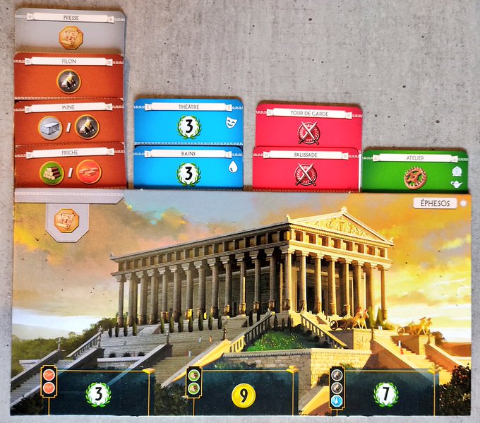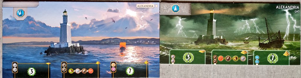 Le changement graphique continue avec les merveilles, cœur du jeu, elles devaient avoir la part belle. Et c’est le cas ! Les plateaux merveilles sont plus grands et j’entends déjà les gens avec des petites tables hurler : « Ouiiii mais 7 Wonders fallait déjà une grande table, les cartes étaient en diagonales, ça prenait de la plaaaace »