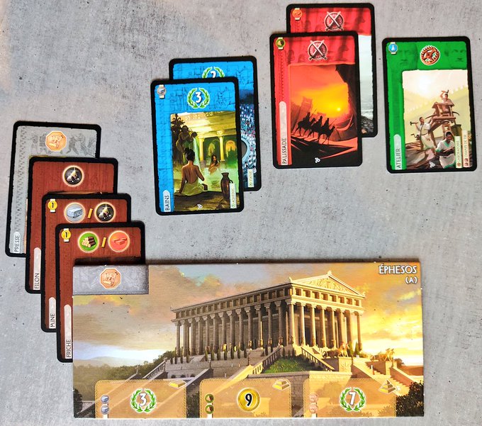 Et ils ont raison ! Sauf que ça n’est plus vrai maintenant ! L’iconographie qui reprend celle de 7 Wonders Duel permet un empilement des cartes beaucoup plus restreint et optimisé. On a plus besoin de se tordre le coup pour lire le nom des cartes et on a accès facilement aux chaînages ainsi que des icônes permettant aux daltoniens d’identifier rapidement les catégories des cartes.