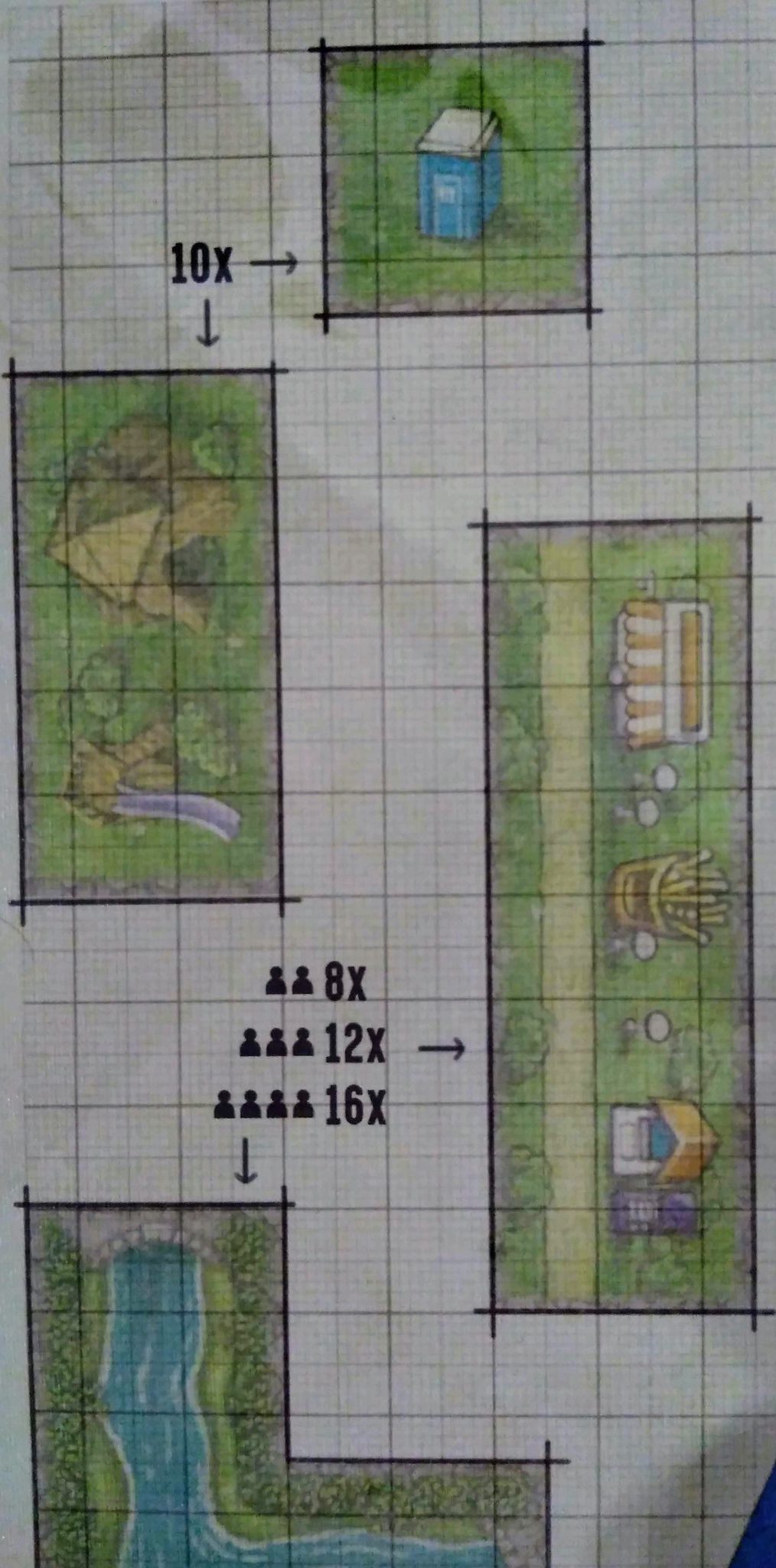 Si vous placez une de vos tuiles sur un symbole brouette par exemple vous pourrez acquérir une tuile espace vert avec des toilettes, des allées ou des magasins. Si votre tuile recouvre deux symboles en même temps vous prenez une tuile correspondant à chaque icone recouvert. Il sera donc intéressant d’optimiser les placement pour ne pas se retrouver à court d’infrastructures à placer.