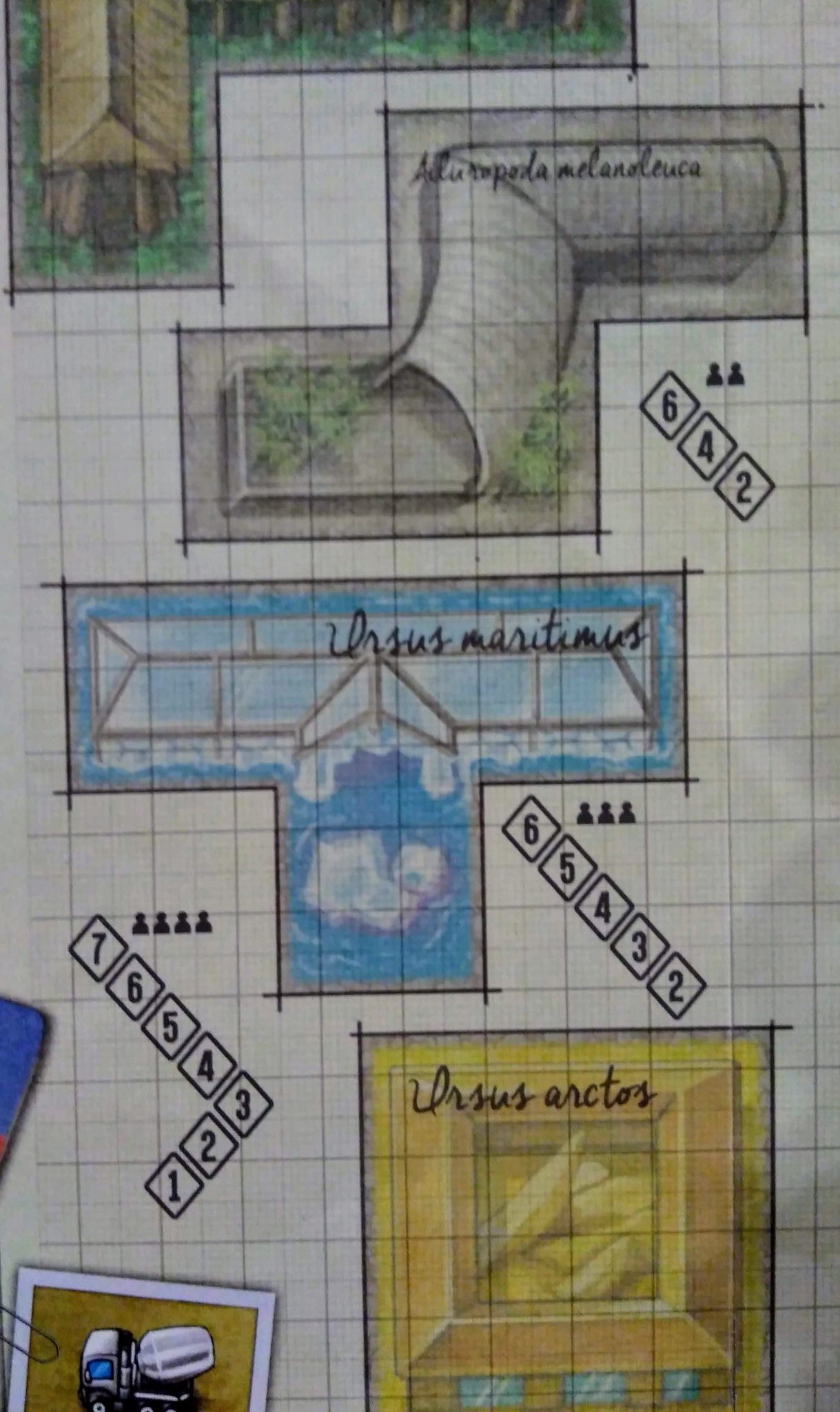 En recouvrant une case avec des ouvriers vous aurez la possibilité d’agrandir l’espace de votre parc en recevant un nouveau plateau que vous collerez à celui que vous avez reçu en début de partie. Il sera important d’étendre votre parc car certaines tuiles ne peuvent être placées sur un seul plateau.