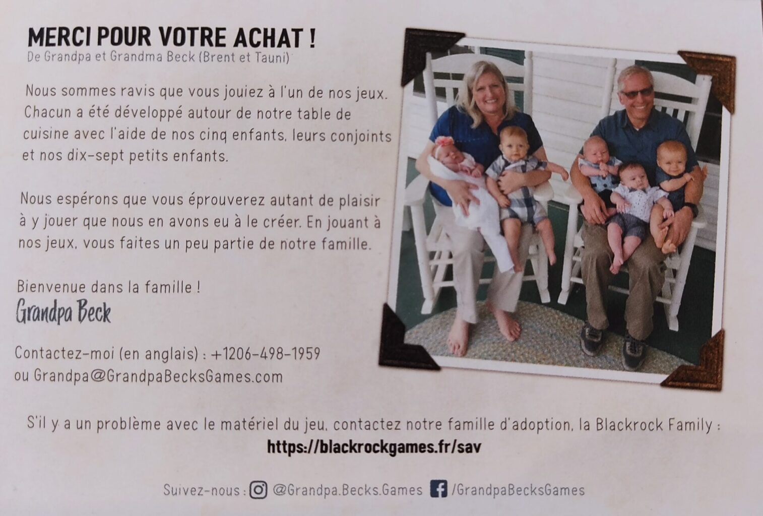 Petit point de détail qui est complètement en dehors de l’aspect ludique et graphique (les cartes sont rigolotes !) mais j’ai été assez surpris en ouvrant la boite de Cache ton Cash, dedans on y trouve une carte postale représentant les grands parents idéaux avec leurs 4 petits enfants et un mot de remerciement accompagné d’une recette de dips au fromage doré. C’est assez déroutant de trouver des éléments marketing américain dans un produit localisé mais pourquoi pas. Vous pourrez même appeler Grand Père Beck via un numéro de téléphone, je n’ai pas poussé le test jusqu’à essayer d’appeler pour être franc ^^ N’hésitez pas à me dire si vous le faites !