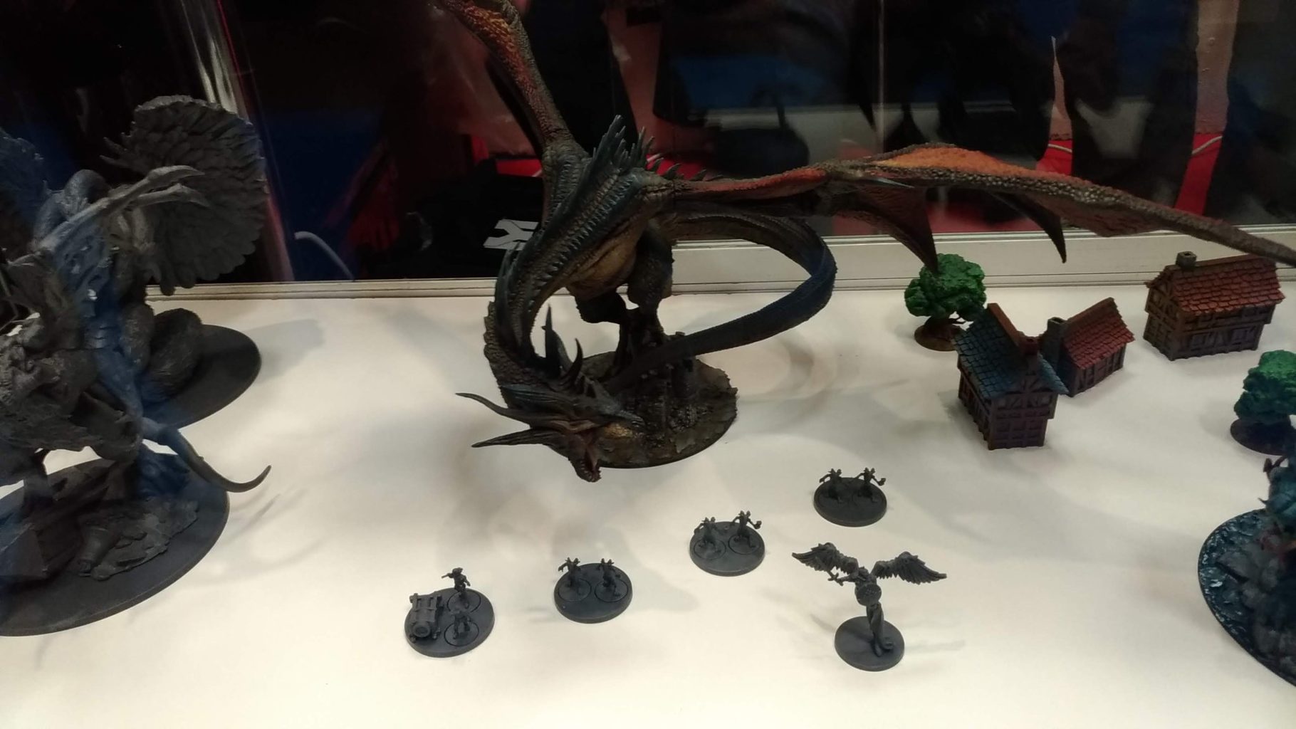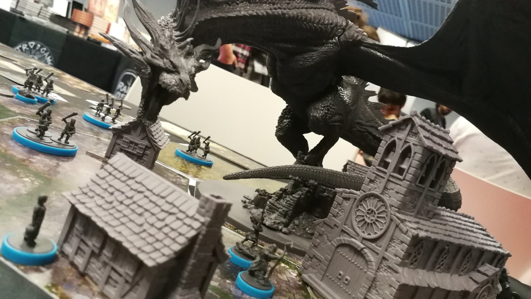 Impossible de louper le stand de Mythic Games. Ses vitrines remplies de magnifiques figurines peintes avec talent, ses nombreuses tables de démo avec des jeux impressionnants, pas de doute, on est au paradis des amateurs de jeux de figurines. On a pu y admirer celles de Joan of Arc. LE jeu de figs de la démesure. Issu de kickstarter, Joan Of Arc est en train d’être livré aux backers avec un All-in affichant 42kg de matériel ! Dans les vitrines du stand on a pu contempler certaines figurines magnifiquement peintes, dont le Dragon qui en imposait vraiment. Comparé aux unités de 15 mm, il est titanesque.