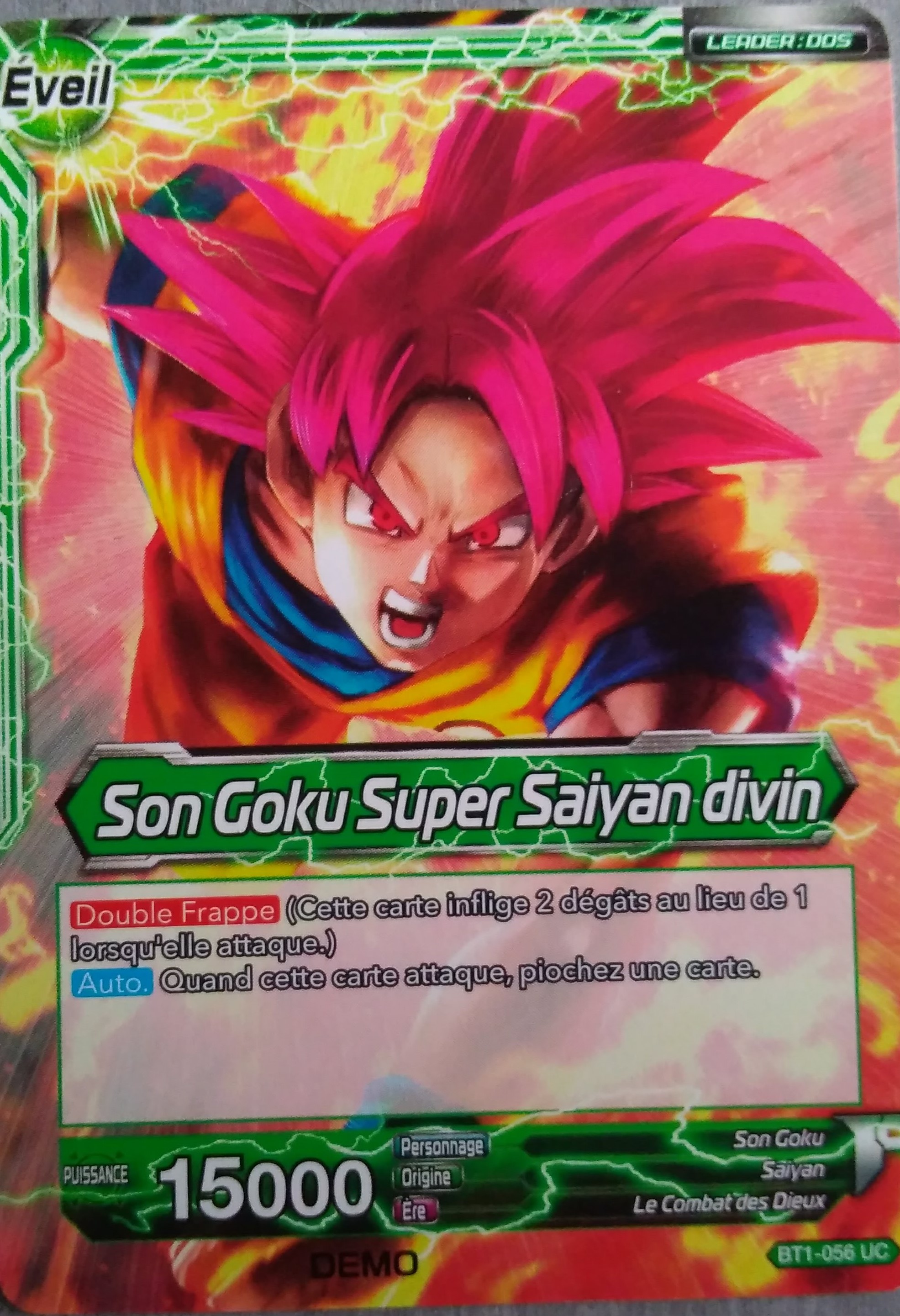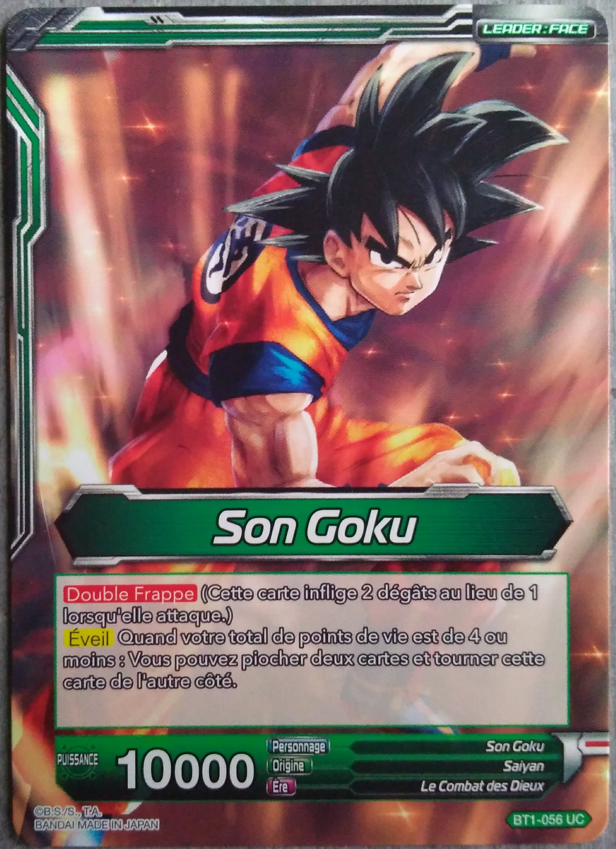 Dans Dragon Ball Super, vous possédez donc un leader qui sera la carte autour de laquelle va s’articuler votre jeu. C’est un personnage charismatique de la série et nous pouvons trouver Freezer, Beerus, Broly et celui présent dans le kit de démo : Son Goku.
