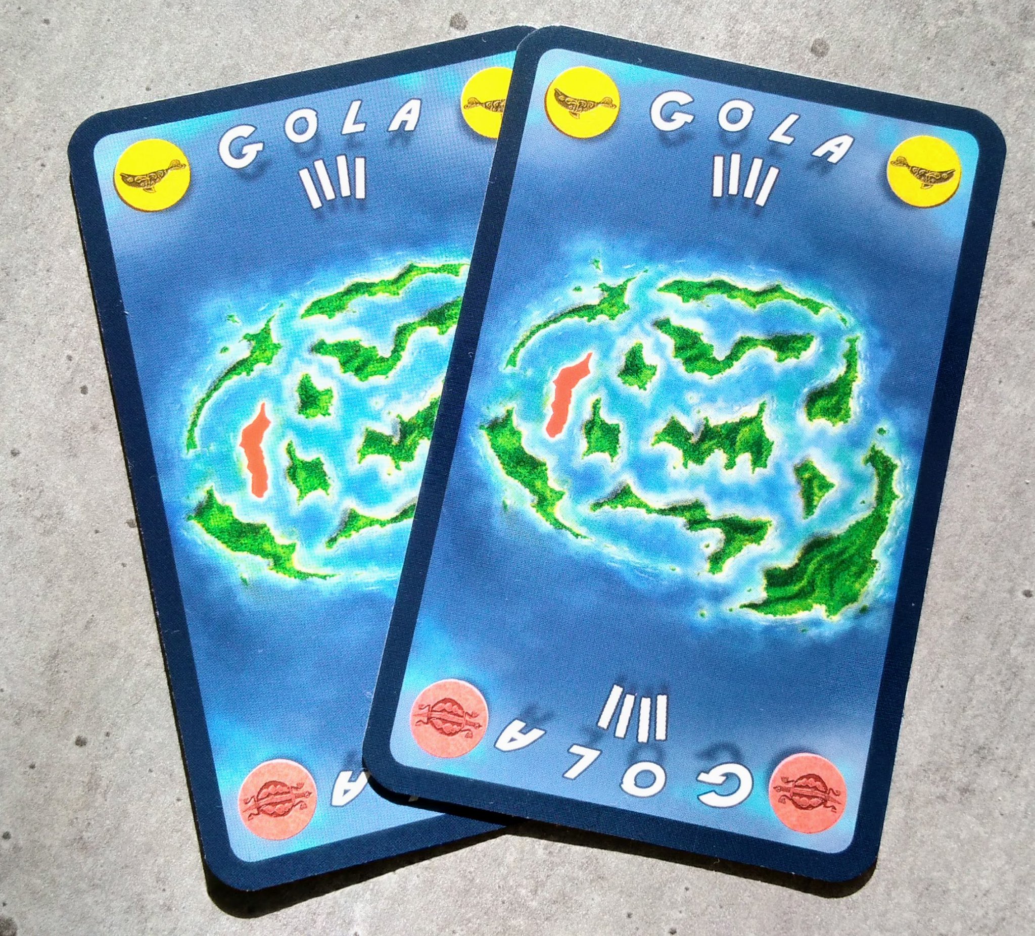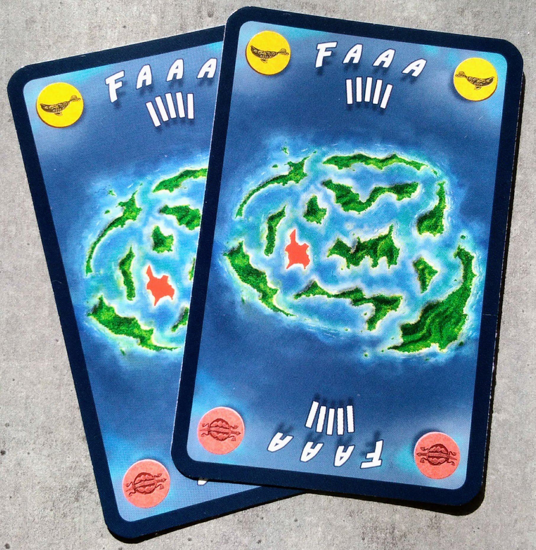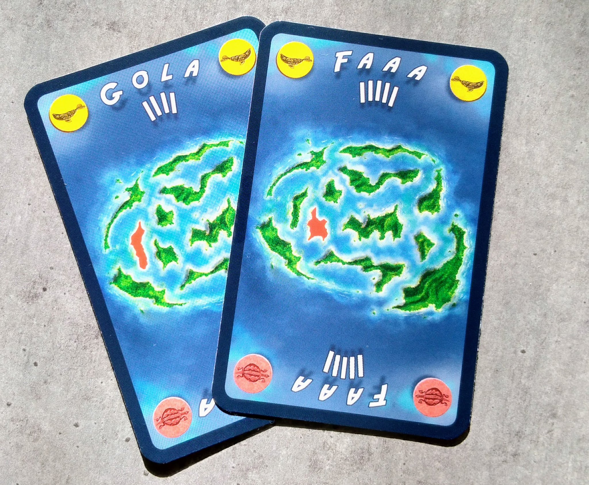 Le matériel est bien pensé, les pions en bois représentant les ponts et le contrôle d’une île sont classiques mais efficaces. Les cartes îles disposent de quatre représentations de dauphins et de tortues de couleurs pour pouvoir les mettre dans le bon sens et se représenter rapidement la place de l’île dans l’Atoll. C’est peut être un détail mais le placement étant la clé du jeu, c’est loin d’être sans importance.