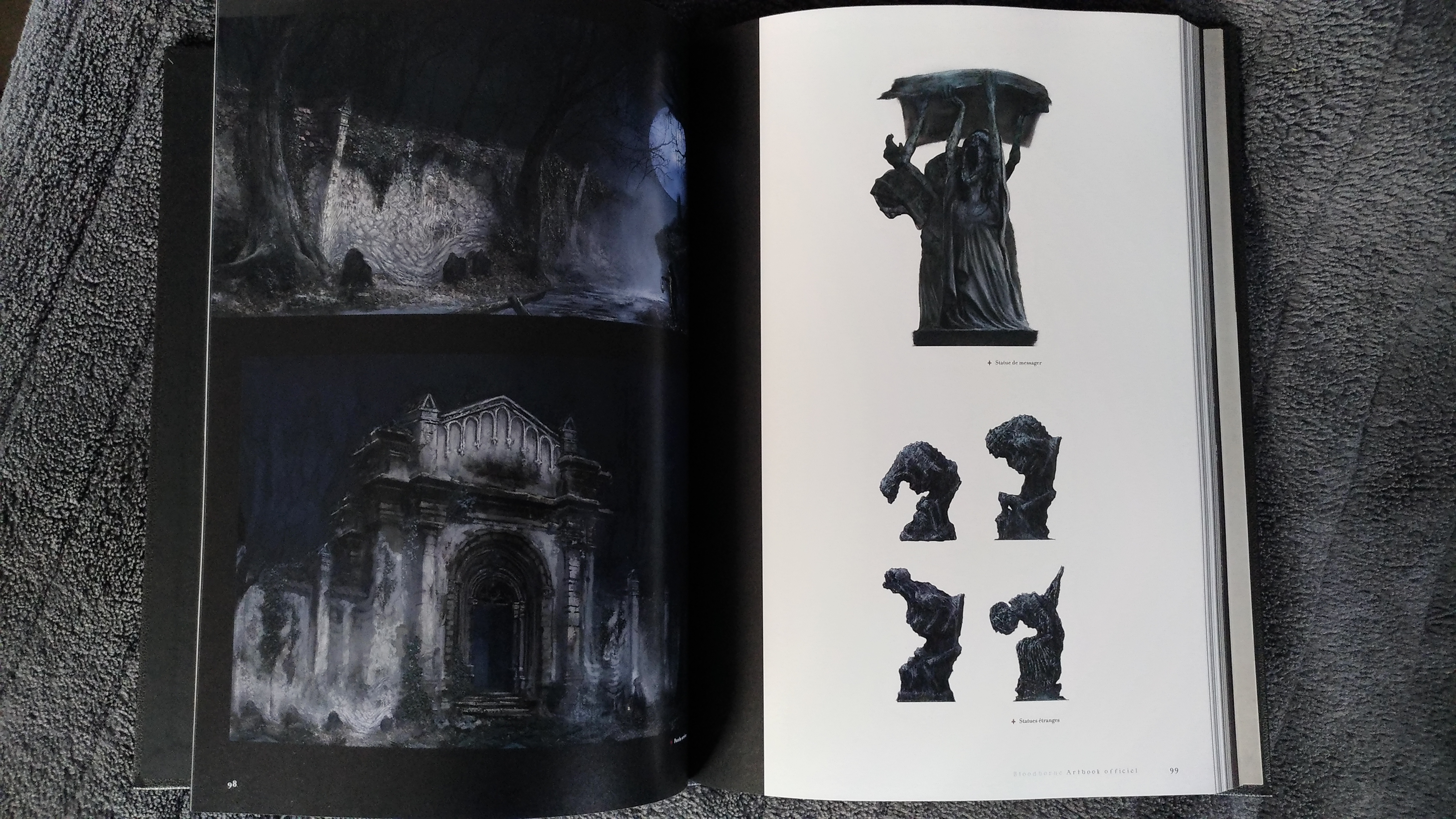 On ne va pas se mentir, j’avais adoré l’univers de Bloodborne. Les rues néo-gothiques de Yharnam, son bestiaire dark fantasy et les entités cosmiques lovecraftiennes qui peuplent des dimensions parallèles m’avaient séduit au plus haut point. N’ayant que très rarement le temps de recommencer des jeux, les artbooks me permettent de replonger de temps en temps dans des univers que j’ai appréciés. Bloodborne – l’artbook officiel est un bel objet : au format A4 et avec ses 256 pages, il permet de profiter dans d’excellentes conditions des illustrations. La couverture RIGIDE est sobre et raffinée, seul un “Bloodborne” argenté apparaît au premier coup d’oeil, mais en y prêtant plus attention, on distingue une marque du chasseur comme gravée dans la pierre, ici encore, c’est une réussite. Cette couverture est presque une métaphore du jeu, on y voit l’essentiel au premier coup d’oeil mais il faut faire la démarche de s’y intéresser en détail pour en découvrir toute la richesse. Au niveau de la qualité du papier, j’ai lu de mauvaises critiques dessus sur Amazon, j’étais donc un peu inquiet après ma commande, ayant peur de recevoir un artbook imprimé sur un papier trop fin. Dès la réception, je me suis empressé de vérifier ce point qui me tracassait, et tout est OK, je ne comprends pas l’avis négatif Amazon… Alors certes ce n’est pas du papier 250 grammes, mais le livre faisant plus de 250 pages, on se serait retrouvés avec un artbook de la taille d’un dictionnaire (complètement inutile), et beaucoup plus cher.