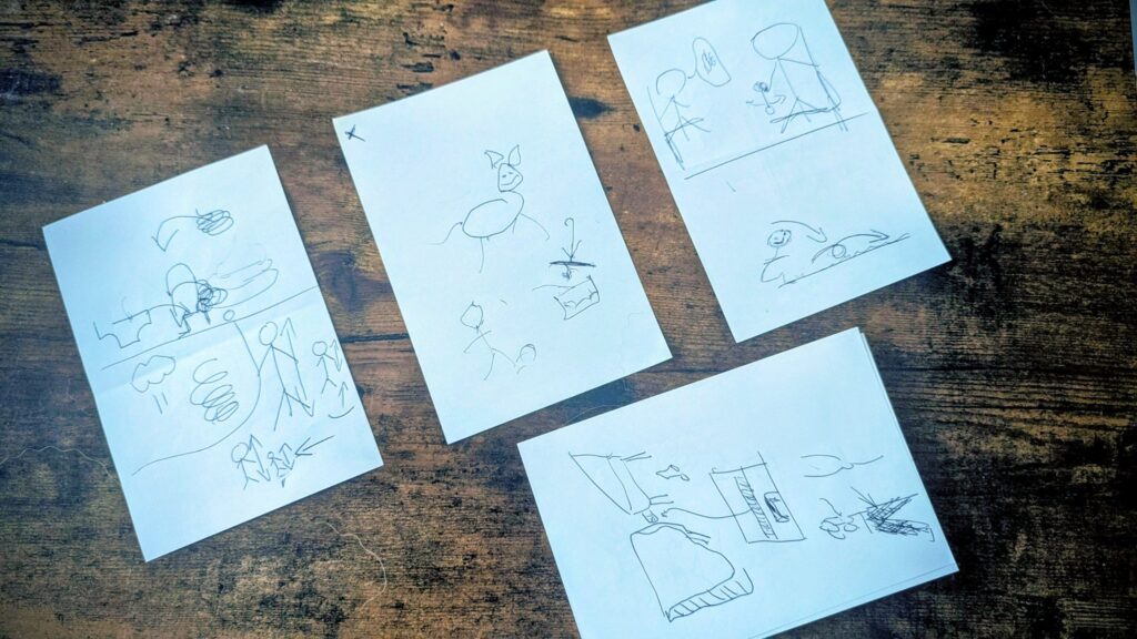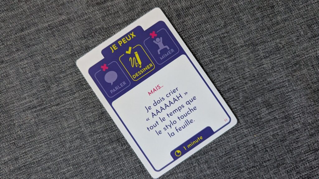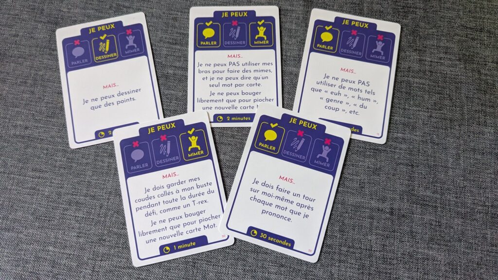 Les défis dessin et mime ne sont pas en reste en demandant de ne dessiner qu’avec des points ou en bougeant la main d’un autre joueur qui tient le stylo… Certaines cartes combinent plusieurs types de défis.