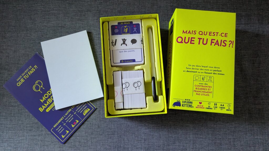 La boîte de Mais qu’est-ce que tu fais?! renferme des cartes Défi, des cartes Mot, un bloc de papier vierge et un stylo. Après avoir fait une pile de cartes Mot, placé 3 cartes Défi face cachée à coté et mis à portée de main le stylo, le bloc de feuilles et un chronomètre, la partie peut commencer.
