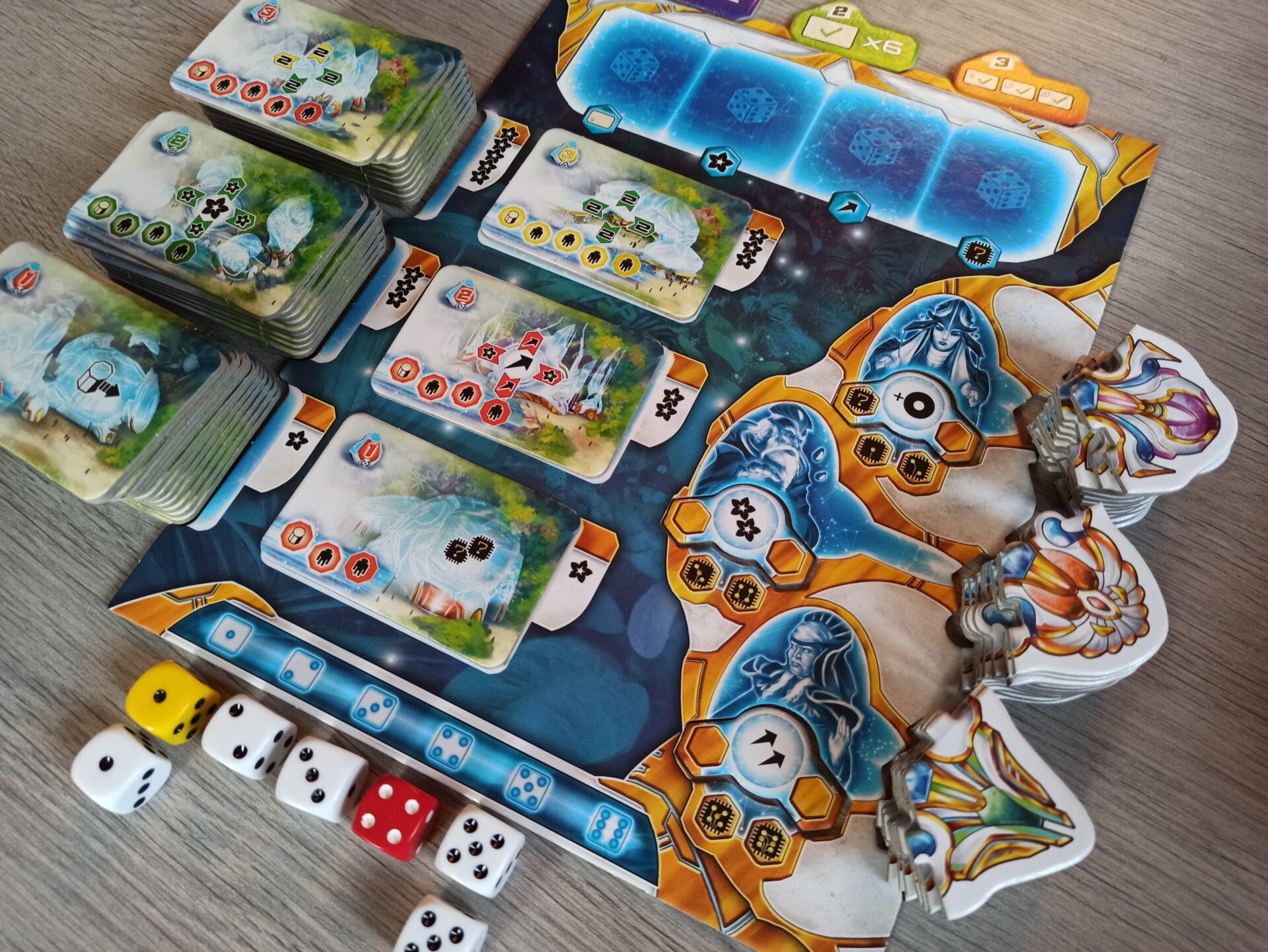 Avec une appellation de titre expert répété un peu partout dans la promotion du jeu, nous nous attendions à une mise en place laborieuse nécessitant autant de temps de préparation que de plaisir. Contre toute attente, une fois assimilée celle-ci se révèle plutôt rapide. Chacun reçoit un plateau individuel ainsi que quelques éléments sur lesquels nous reviendrons par la suite dans la présentation des actions. Un plateau central est ensuite disposé au centre de la table pour y accueillir les anciens, les artefacts, les objectifs de la prophétie, les 9 dés et les cartes de bâtiments à construire. Concernant les dés, il faut effectuer un premier lancer, et les placer sous les pictogrammes correspondant à leurs valeurs. Et c’est tout, on a connu plus complexe pour un jeu expert ! Il y a pas mal de petits éléments à placer donc, et on aurait bien aimé un petit thermoformage pour se faciliter un peu la tâche du tri des cartes ou artefacts.