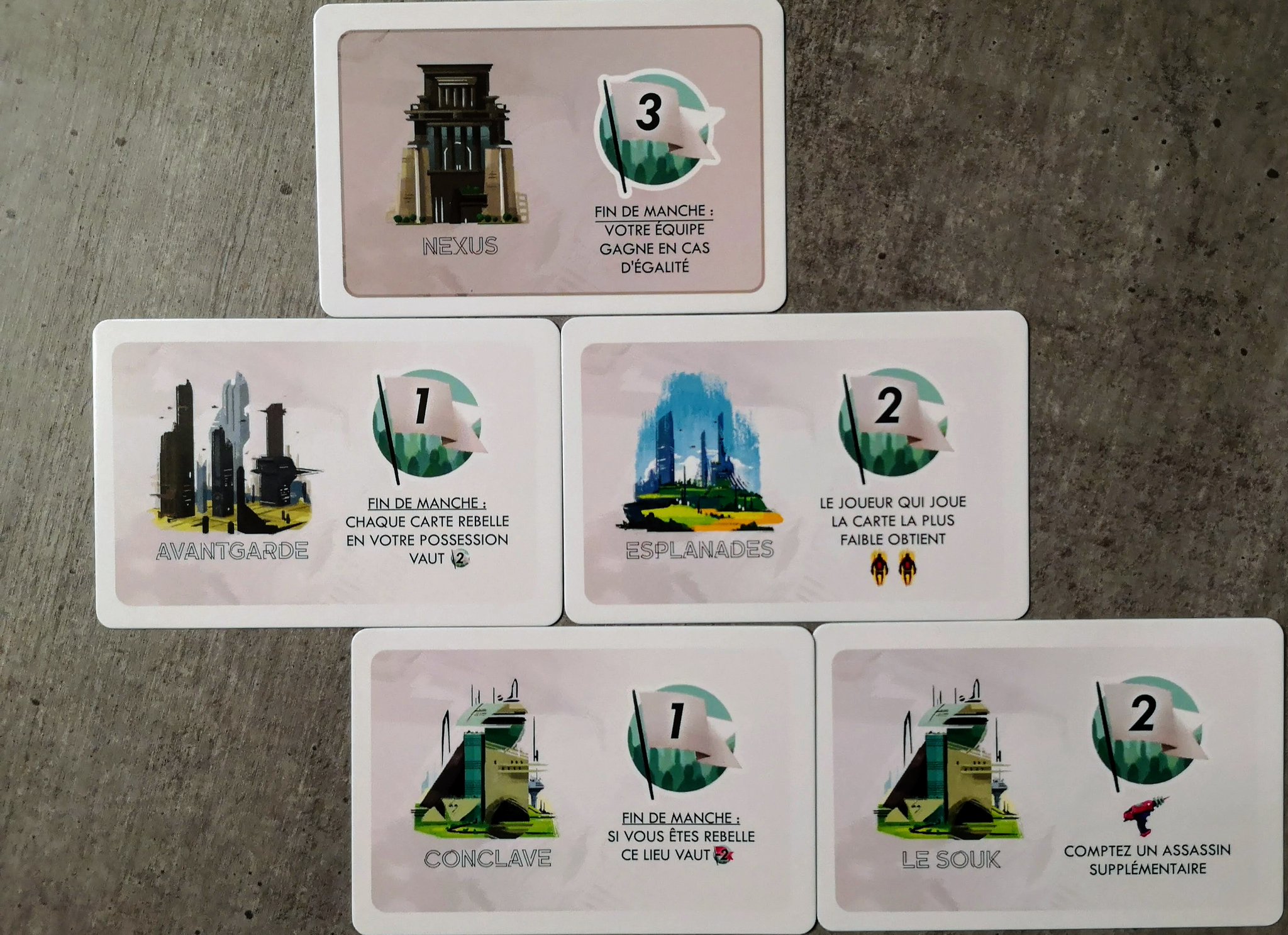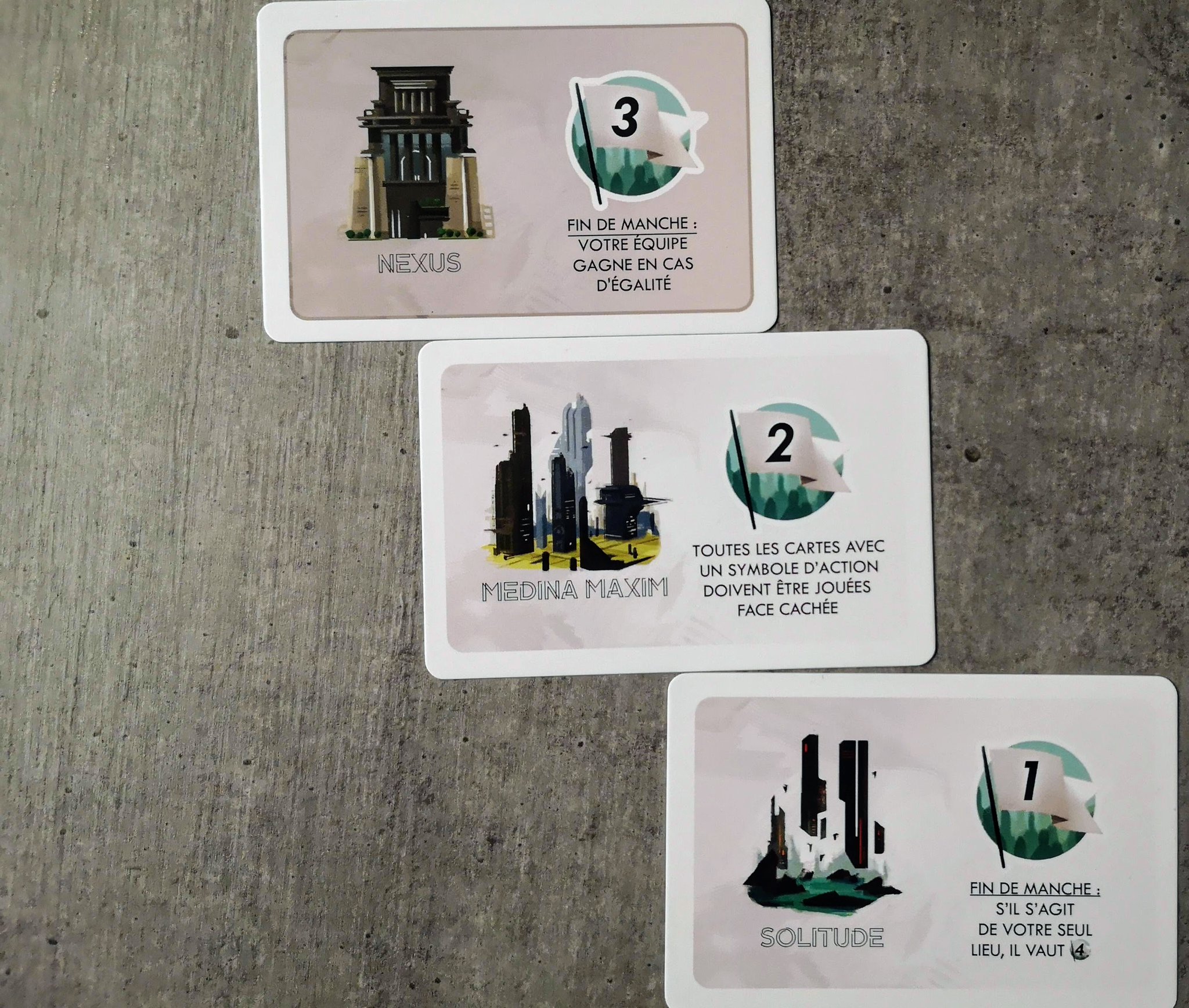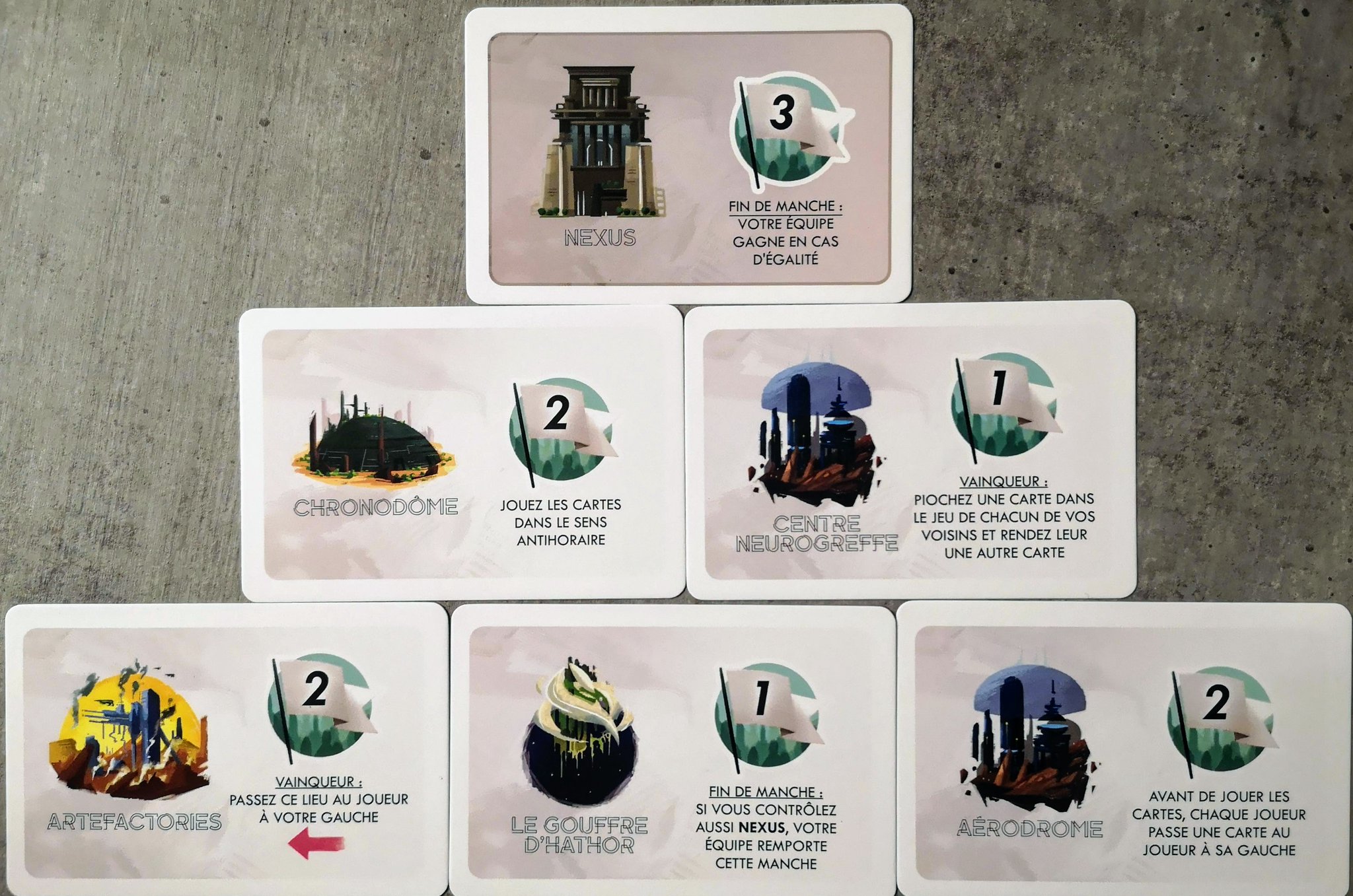 Les lieux sont disposés en pyramide en début de manche. Vous ne pouvez activer que les lieux sans autre carte en dessous. Un peu comme les cartes bâtiments dans 7 Wonders Duel.