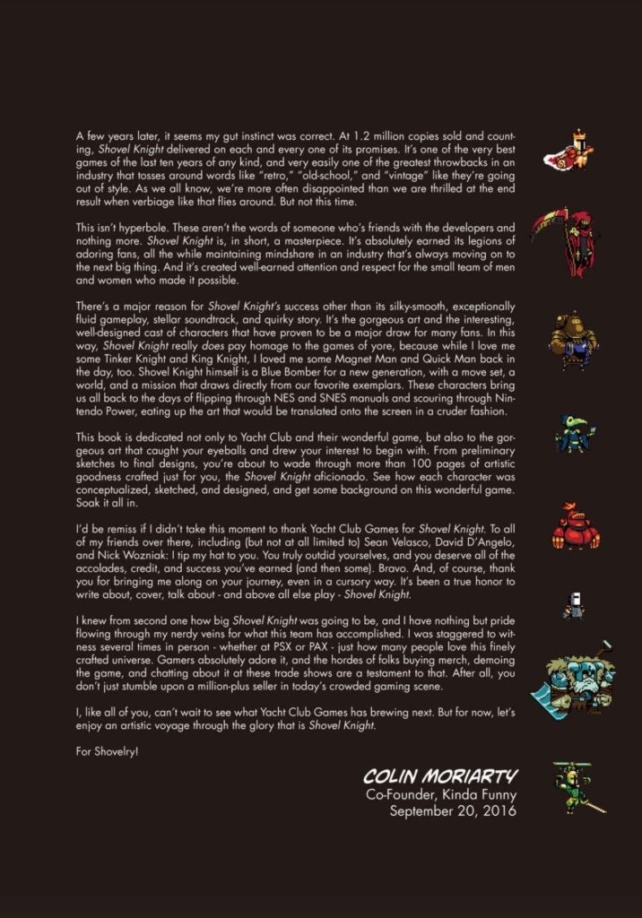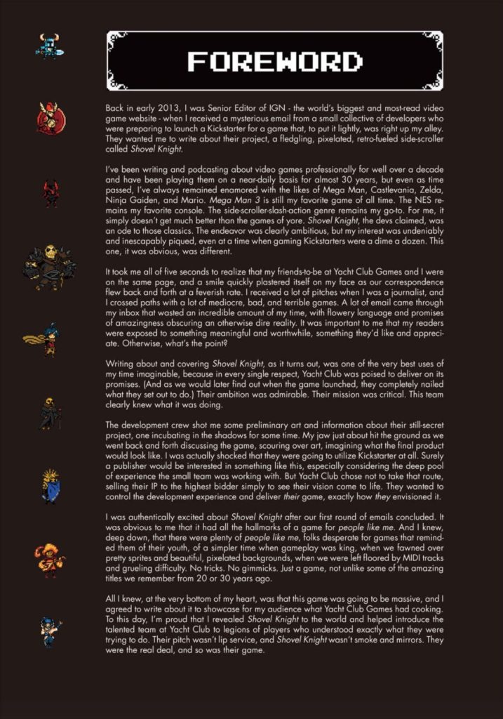 Eh bien, une agréable surprise sur cet art book qui pour moi correspond exactement à ce que je m’attends d’un bon art book. C’est à dire rempli de petites informations et de notes des développeurs et créateurs, des illustrations pour faire briller les yeux, puis enfin une grande partie de texte pour raconter plus de choses en détail dans une interview ou une lettre au lecteur. Je n’étais pas vraiment un grand fan de Shovel Knight la première fois que j’y ai joué.