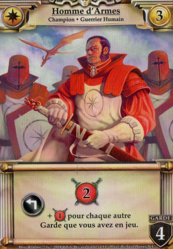 Les actions et objets fonctionnent de la même façon que les vaisseaux dans Star Realms, après les avoir joué, vous les défaussez. Les champions quant à eux ont les mêmes mécaniques que les bases, ils restent en jeu et peuvent vous apporter des ressources à chaque tour. Certains champions ont un bouclier noir et la notion “Garde” cette mention signifie qu’ils doivent être traité comme les avants postes de Star Realms. Pour ceux n’ayant pas joué à ce dernier, les avants postes sont des bases qu’il est obligatoire de détruire en premier pour pouvoir infliger des dégâts à son adversaire où à ses autres bases/champions.