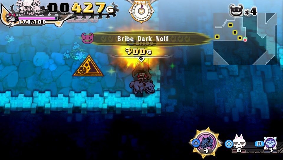 Comme vous l’avez compris Penny-Punching Princess est un beat’em up où vous allez fracasser des monstres à coups de poing, grâce à vos pouvoirs ou leurs pouvoirs. Les combats se font principalement en petites arènes qui se refermeront sur le long du niveau que vous allez parcourir. Il faudra vaincre tous les monstres pour être libérée. Mais par vaincre, je veux dire qu’ils peuvent aussi rejoindre vos rangs. Car oui vous allez acheter les monstres pour ensuite les utiliser, il en va de même pour les pièges. Chaque monstre et chaque piège ont un prix, il faudra leur donner la bonne somme pour les utiliser au cours du niveau et également les ajouter à vos citoyens. C’est là où repose tout le principe du jeu et il faut dire qu’il marche très bien.