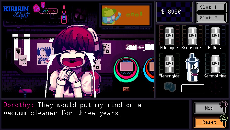 Vous l’aurez compris étant une visual novel à la base, VA-11 HALL-A n’a pas tellement de gameplay. En dehors de devoir chercher dans la base de données parmi les 24 boissons puis la mixer correctement, vous n’aurez pas d’autre type de gameplay. Pour cela il suffit de faire des mélanges parmi les 5 ingrédients de base :