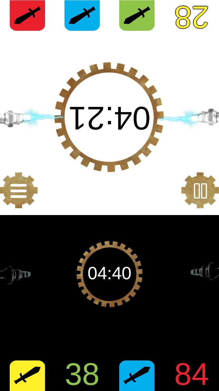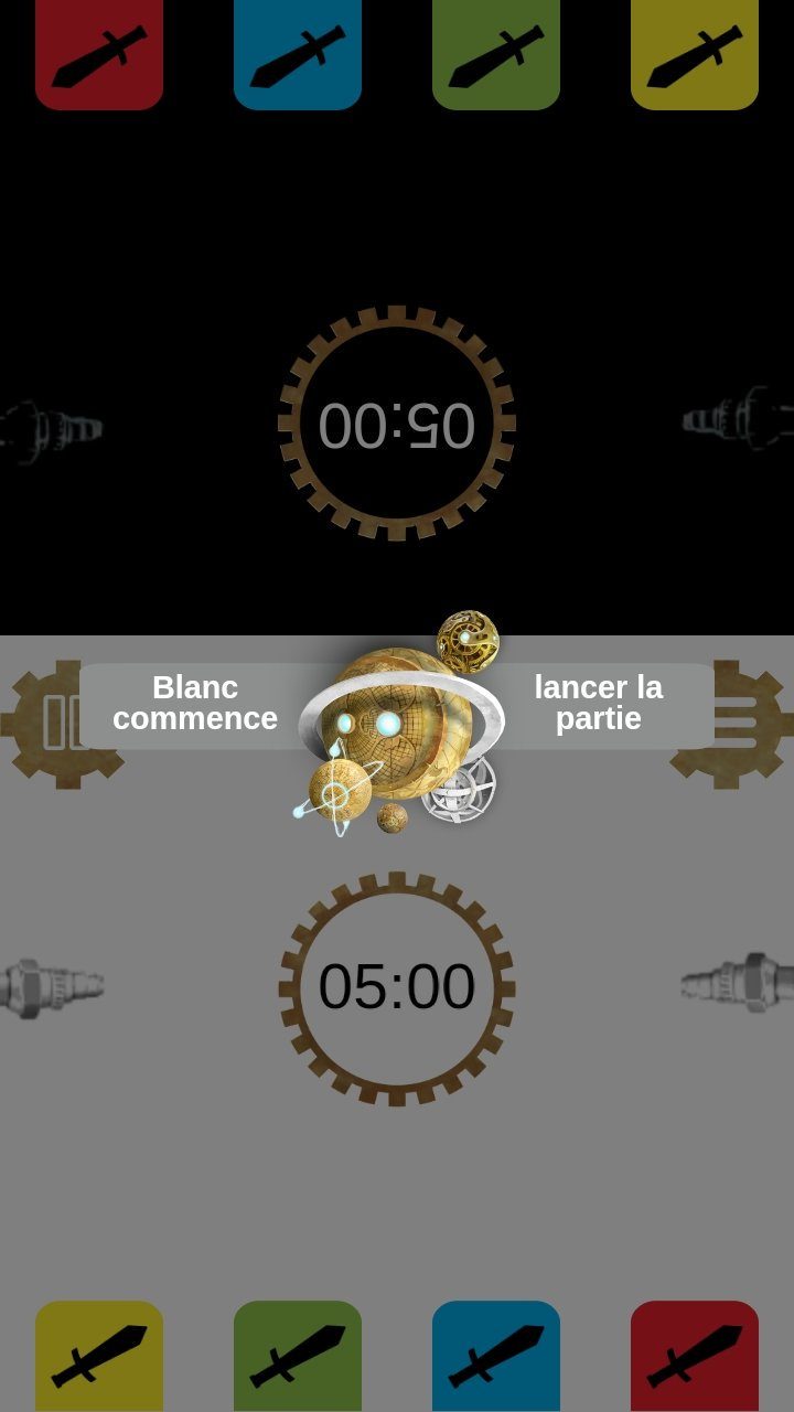 Un téléphone/tablette : Et oui, il vous faudra incorporer un peu de numérique dans Time Arena, une application gratuite et bien foutue sert de chronomètre Blitz, il suffit de toucher l’écran pour que la main passe à votre adversaire. Une option permet de représenter les sabliers dans l’application pour plus de précision.