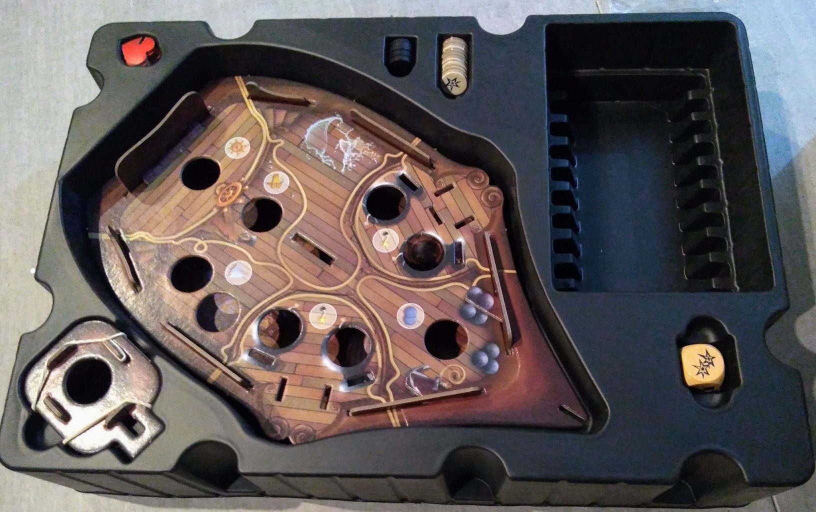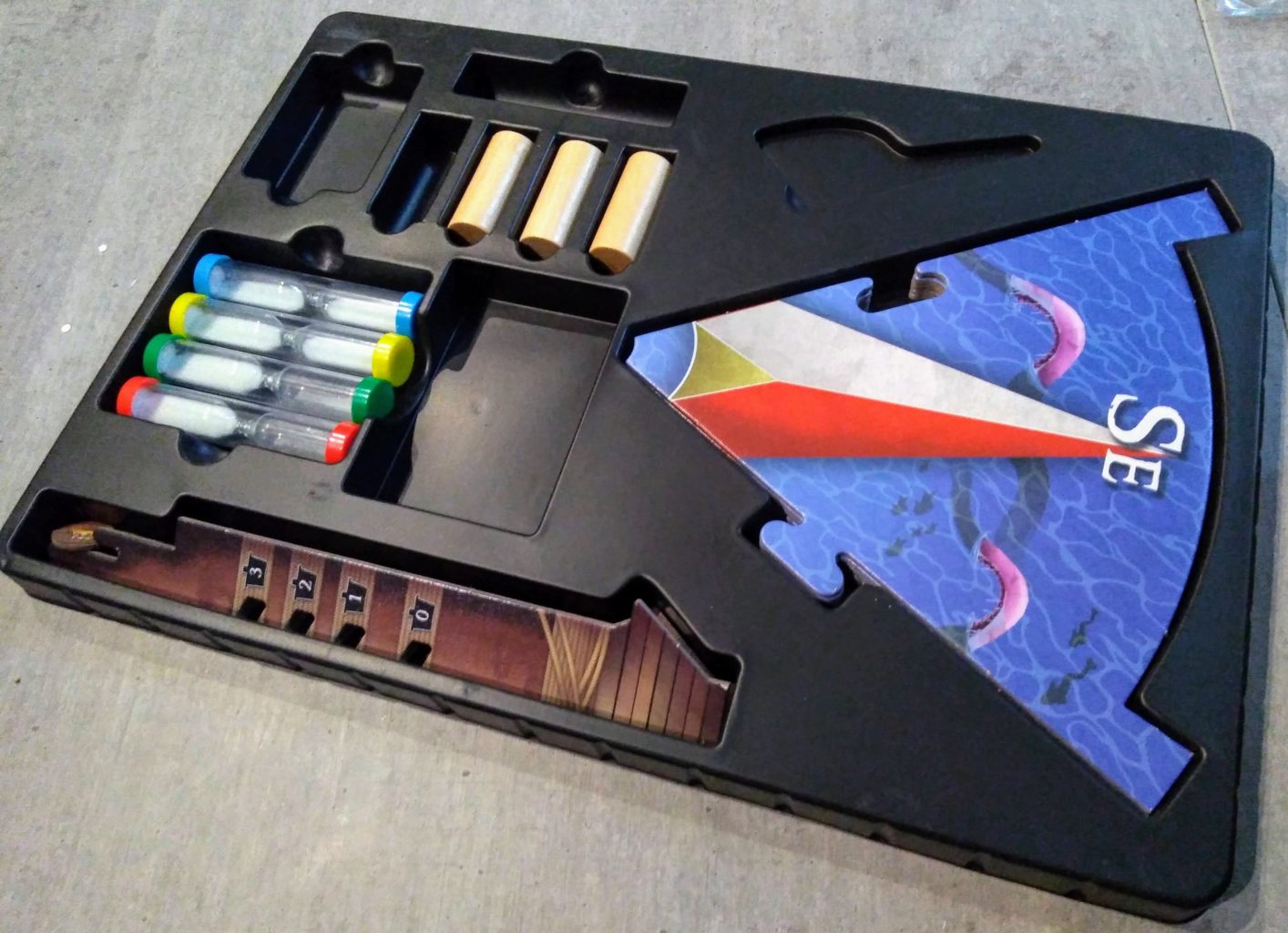 Malheureusement, le sablier à un tout petit rebord à sa base qui fait qu’on accroche régulièrement le carton. Si dans les autres postes c’est un peu frustrant, surtout quand on a une brute à la table qui tire fort et rapidement le bateau. Pour la vigie c’est une catastrophe, elle se démonte trop rapidement.